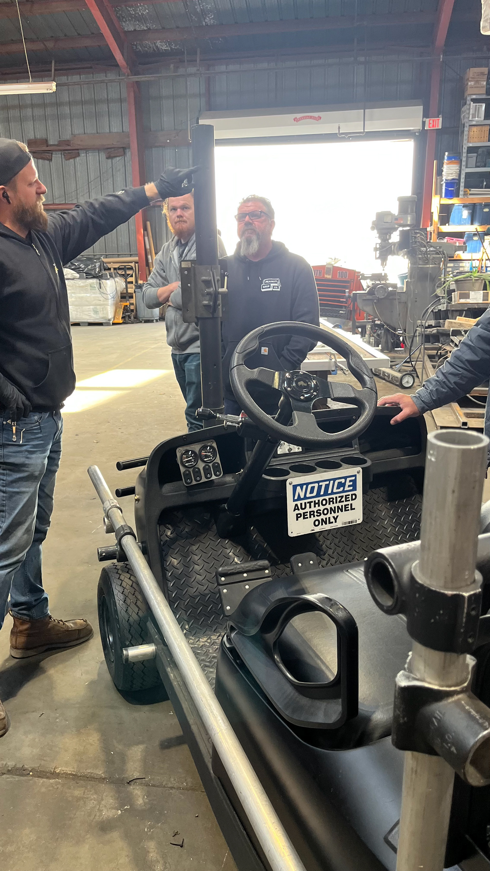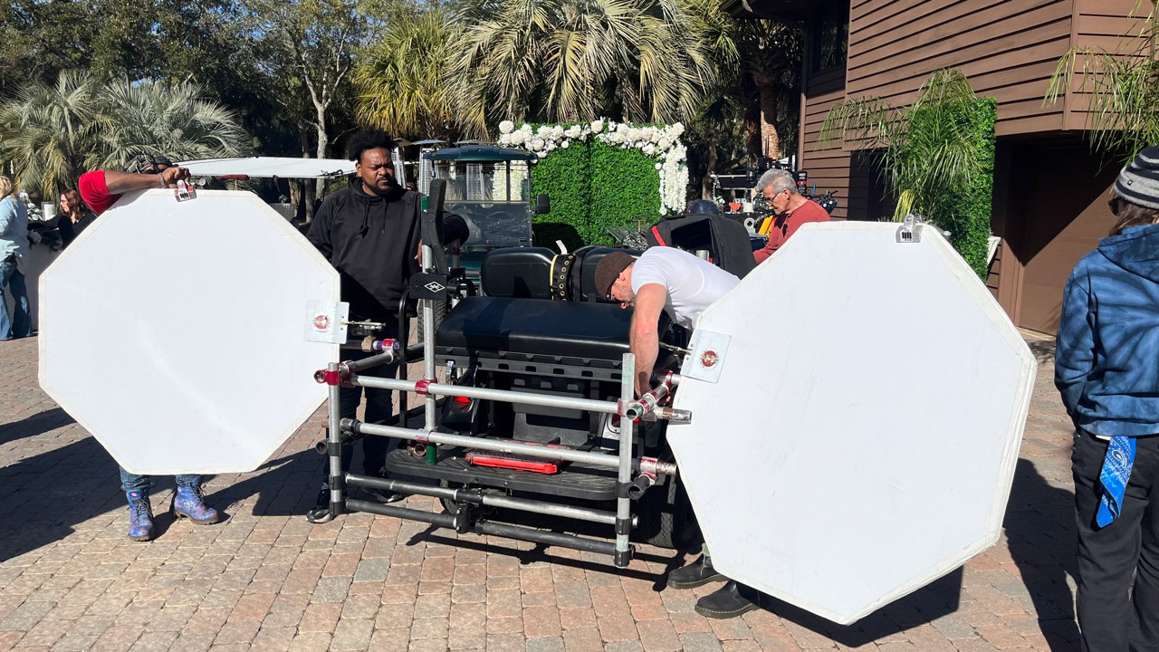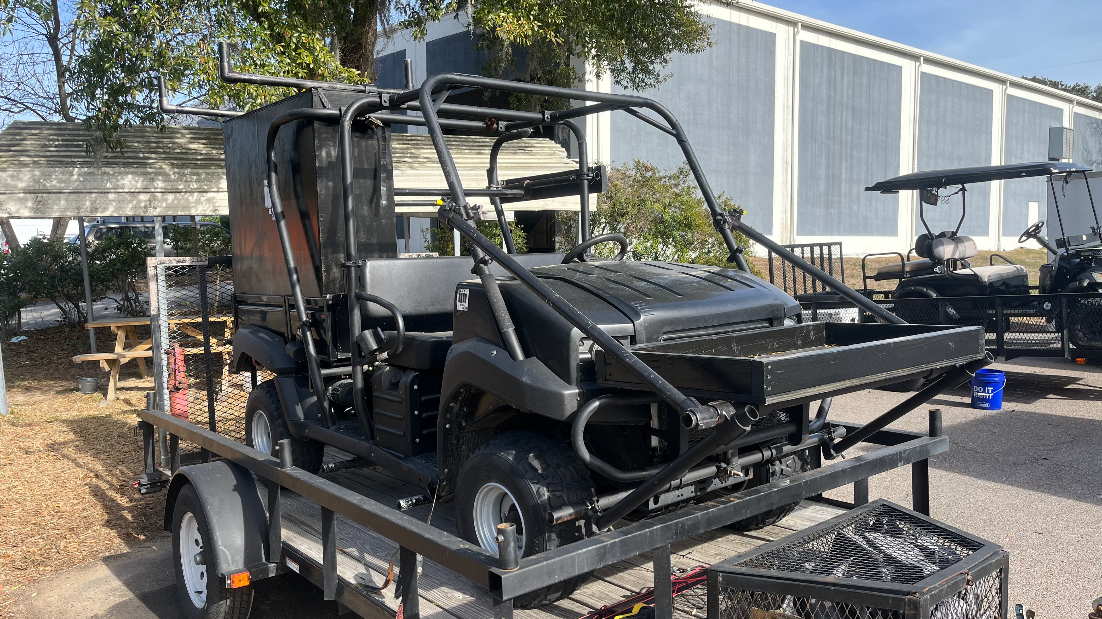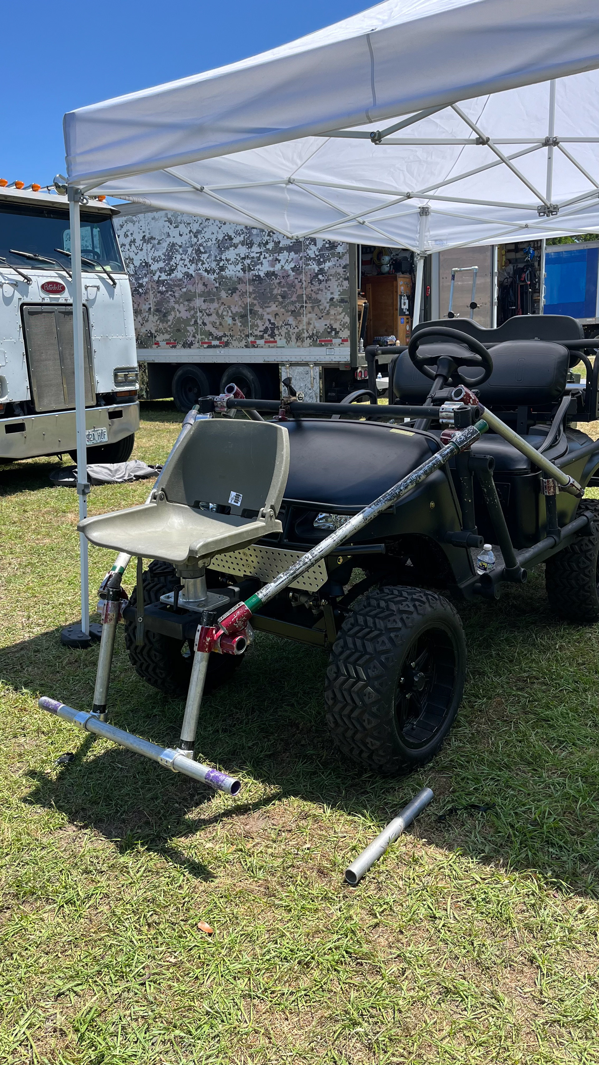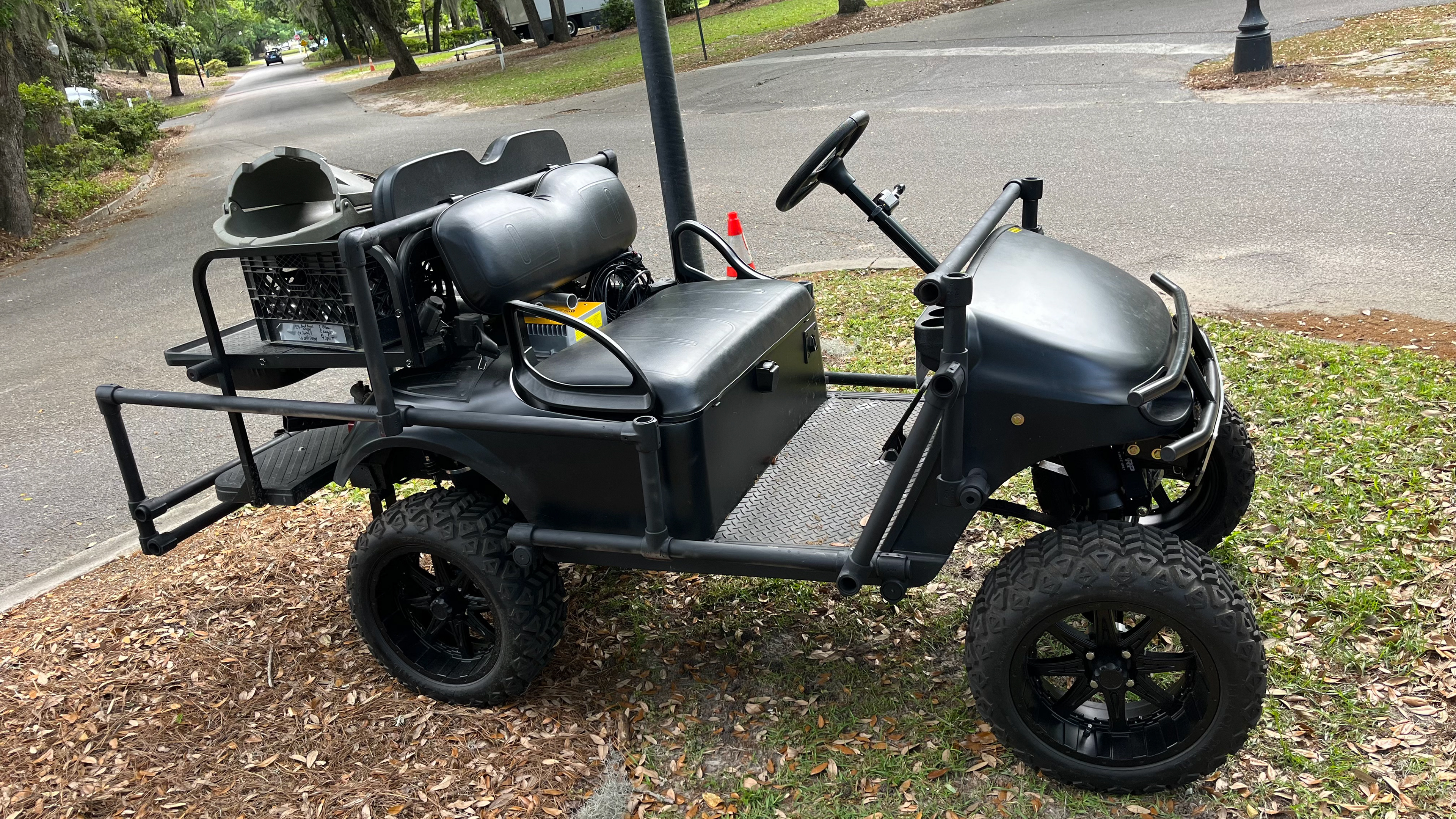 The 2023 EZ GO TXT CUSOM GOLF CART. CAPABLE OF 30+ MPH FULLY ADJUSTABLE FOR SLOW WALK AD TALKS TO FAST CHASE SEQUENCES.